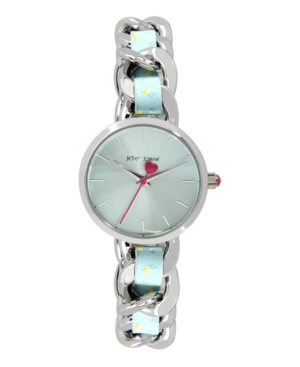 Betsey Johnson Women-s Woven Floral Silver-Tone and Floral Printed Polyurethane Bracelet Watch 30mm
