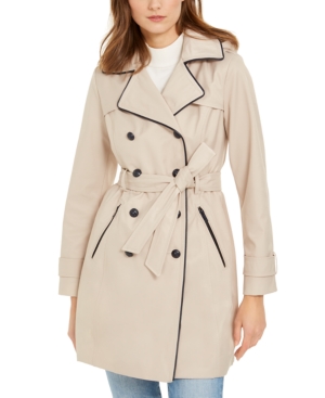 Guess Hooded Faux-Leather-Trim Water-Resistant Double-Breasted Trench Coat